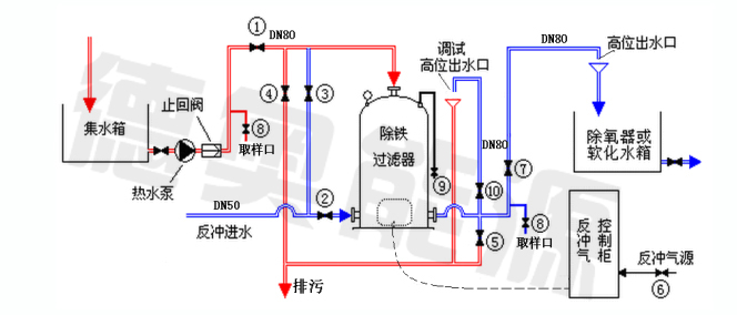 1、傳統的除鐵錳設備為保證濾料不板結,大多要配置反沖洗水箱及大功率、大流量反沖泵,反洗用水量大,一般是過濾總量的5%,這一特性很不適合蒸汽鍋爐冷凝水的過濾。本系統采用獨家研制的氣水復合反沖洗系統,僅用很少的能源和水量50噸就能達到反洗要求的膨脹率,將系統清洗干凈恢復正常工作。
