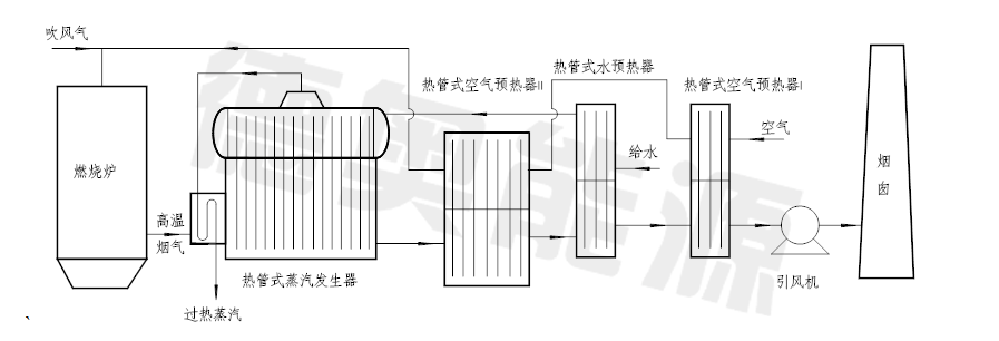 在化工工業(yè)中,很多余熱是蘊(yùn)含在煙氣中排放的,以合成氨和制酸行業(yè)產(chǎn)生的廢煙氣為最。回收其低溫余熱可用來(lái):預(yù)熱助燃空氣、預(yù)熱鍋爐給水、或生產(chǎn)低壓蒸汽作為生產(chǎn)原料;回收高溫余熱產(chǎn)生中壓蒸汽作原料蒸汽補(bǔ)充,或生產(chǎn)高壓蒸汽作為生產(chǎn)的動(dòng)力源。圖1為熱管式換熱器在廢氣余熱回收中的典型流程。