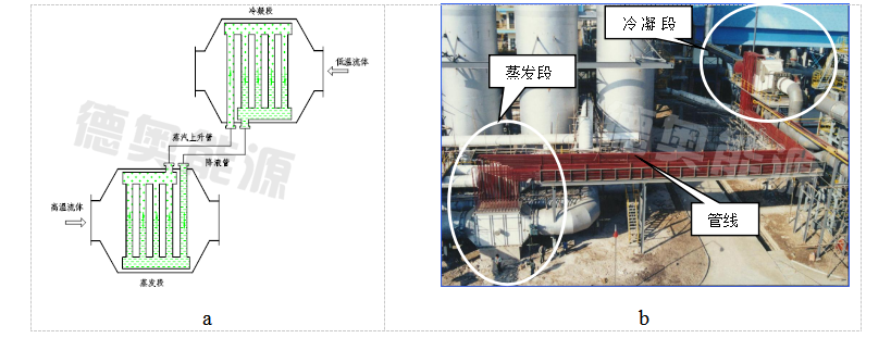 圖2為某廠的熱管空氣預(yù)熱器,a為換熱器內(nèi)部簡(jiǎn)圖,b為實(shí)物照片,采用的是分離式結(jié)構(gòu)型式,連接管線達(dá)50m,實(shí)現(xiàn)遠(yuǎn)程傳熱。此外該型式換熱器還可實(shí)現(xiàn)煙氣同時(shí)與多種氣體進(jìn)行熱交換,除了加熱空氣外,還可加熱其他工藝氣體,從而實(shí)現(xiàn)廢熱利用的最大化。