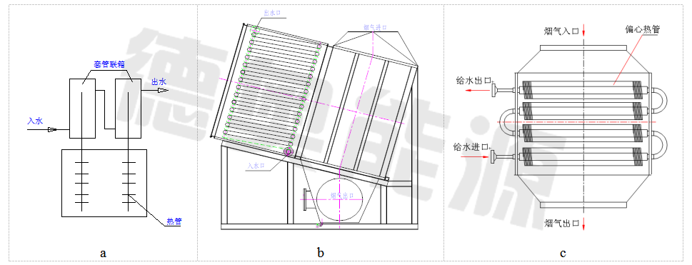 熱管水預(yù)熱器,或稱熱管省煤器,多用于回收低溫?zé)煔庥酂醽?lái)預(yù)熱除氧器給水,或鍋爐給水。水側(cè)通常采用套管聯(lián)箱結(jié)構(gòu)型式,可以承受較高的工作壓力,如圖3a所示。圖3b是為某硫酸廠設(shè)計(jì)的熱管省煤器,配備于年產(chǎn)15萬(wàn)噸硫酸裝置,用于鍋爐給水預(yù)熱。煙氣流量為37000 Nm3/h,進(jìn)出口溫度340/160oC,加熱水量為25噸/小時(shí),回收熱量2600kW。該換熱器傾斜安裝,煙氣自上而下沖刷熱管,從而避免積灰現(xiàn)象,同時(shí)也不影響熱管工作。還一種常用熱管省煤器為水平夾套式結(jié)構(gòu),如圖3c所示,采用的是徑向偏心熱管,其詳細(xì)結(jié)構(gòu)及應(yīng)用可參見(jiàn)文獻(xiàn)[5]。