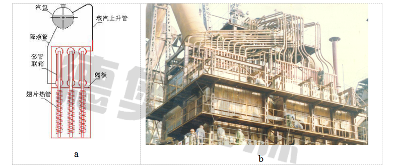 熱管蒸汽發(fā)生器,又稱熱管余熱鍋爐,兼有水管鍋爐和火管鍋爐的優(yōu)點(diǎn),啟動(dòng)迅速。其結(jié)構(gòu)可以是熱管冷端直接插入汽包,也可以是前面介紹的夾套聯(lián)箱與汽包連通的結(jié)構(gòu)型式,如圖4a所示。年產(chǎn)10萬(wàn)噸硫酸的某硫酸廠,采用了一臺(tái)熱管式蒸汽發(fā)生器用以回收SO2爐氣余熱,產(chǎn)生2.5MPa,9.50 噸/小時(shí)飽和蒸汽,回收熱量6497.5kW,如圖4b所示。爐氣經(jīng)過(guò)熱管蒸汽發(fā)生器后降為355℃進(jìn)入電除塵室。圖4a中隔板的下部為熱管的吸熱段,焊有螺旋翅片。上部為熱管的放熱段,采用水夾套結(jié)構(gòu),經(jīng)集箱集汽后經(jīng)上升管與汽包連接。冷熱側(cè)由隔板完全分開, 即使出現(xiàn)有個(gè)別熱管磨損破壞,也只會(huì)是熱管內(nèi)部少量工作流體流入煙道,不會(huì)影響正常生產(chǎn),避免了大量爐水向煙道泄漏而導(dǎo)致停產(chǎn)。各熱管通過(guò)控制加熱段傳熱面積使管壁溫度>230℃,可有效地防止露點(diǎn)腐蝕。如每噸蒸汽按60元計(jì),年運(yùn)行7200小時(shí)效益可達(dá)430余萬(wàn)元,設(shè)備投資可在一年內(nèi)收回。