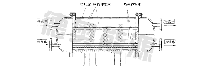 密閉腔式換熱器是熱管技術(shù)衍生的一種新型管殼式換熱器,如圖5所示,其他結(jié)構(gòu)型式參見(jiàn)文獻(xiàn)[7]。密閉腔由兩端孔板與筒體殼體組成,內(nèi)沒(méi)有多余的部件,故而結(jié)構(gòu)簡(jiǎn)單;同時(shí)冷熱流體均走管內(nèi),可以承受高壓而不至于增加殼體厚度,達(dá)到節(jié)約成本的目的;真空密閉腔內(nèi)為相變傳熱,因而冷、熱流體管束外側(cè)具有較高的傳熱系數(shù),通過(guò)合理對(duì)管箱分程設(shè)置冷、熱流體的流速,或者采取管子內(nèi)側(cè)強(qiáng)化傳熱措施,即可實(shí)現(xiàn)整體換熱器的高效傳熱;即使熱流體溫度在三、四十度,也會(huì)使密閉腔內(nèi)的介質(zhì)汽化進(jìn)行工作。工作時(shí),密閉腔內(nèi)工作介質(zhì)處于飽和狀態(tài),并維持一個(gè)穩(wěn)定的壓力和溫度,當(dāng)調(diào)整冷熱流體任一方的參數(shù),腔內(nèi)的工作介質(zhì)的溫度和壓力回迅速進(jìn)行相應(yīng)調(diào)整,從而方便控制另一側(cè)的出口溫度。總的說(shuō)來(lái),該換熱器具有結(jié)構(gòu)簡(jiǎn)單、成本低、熱相應(yīng)快、熱控方便、易于清洗、傳熱效率高,節(jié)能效果顯著等優(yōu)點(diǎn)。